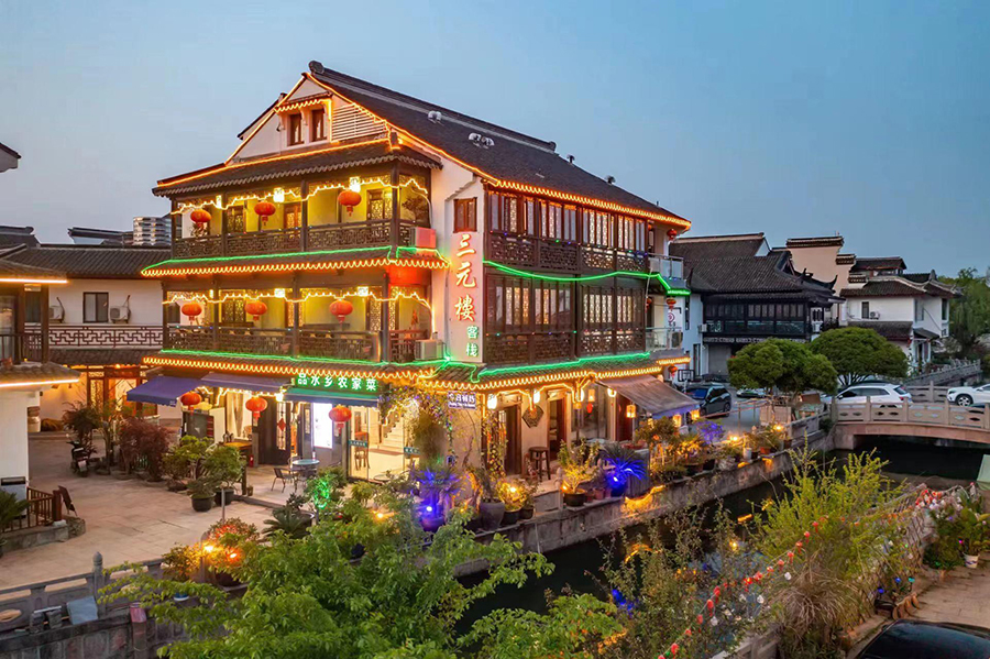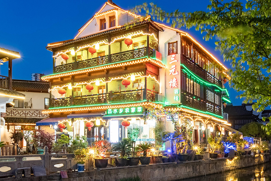 昆山周庄三元楼精品客栈位于江苏省苏州市昆山市周庄镇富贵园路,坐落在国家5A级旅游度假胜地——中国水乡周庄,地理位置极为优越。这里交通出行便捷,步行即达沈万三故居、张厅、南湖秋月园、周庄博物馆、双桥...等代表性景点,去到同里古镇、锦溪古镇、同里国家湿地公园...等也不过35分钟车程,是打卡“小桥、流水、人家”意境的必经之地。不管是白日泛舟古镇河道,看船娘摇橹哼唱吴歌;还是夜幕降临时,感受“君到姑苏见,人家尽枕河”的意境,三元楼都是您探索水乡、安顿身心的理想起点。