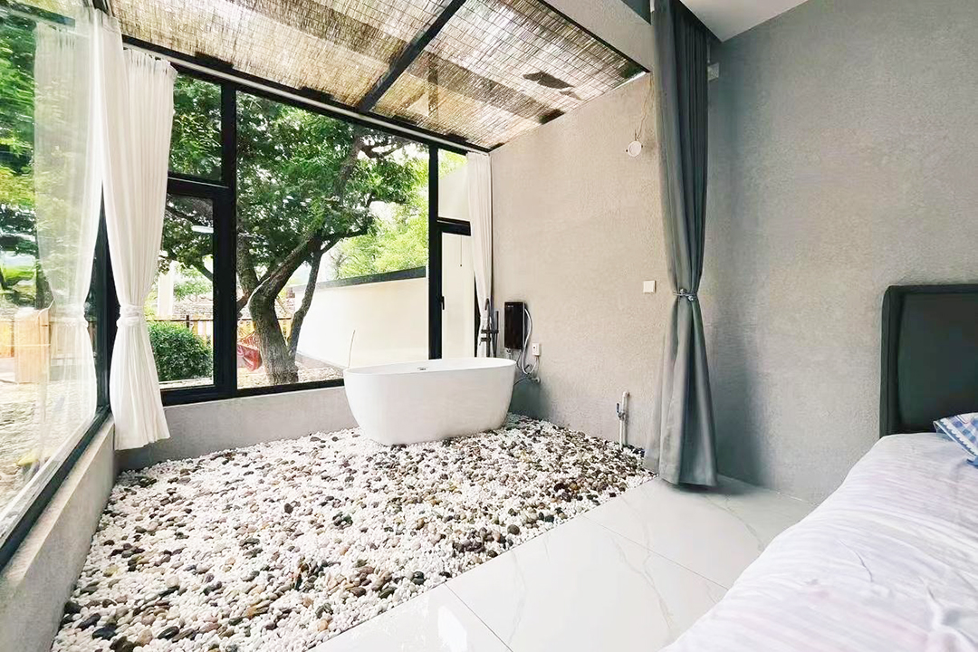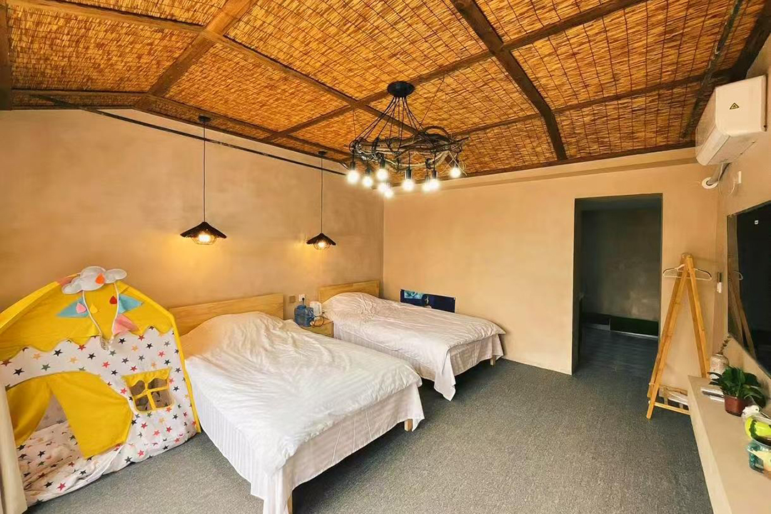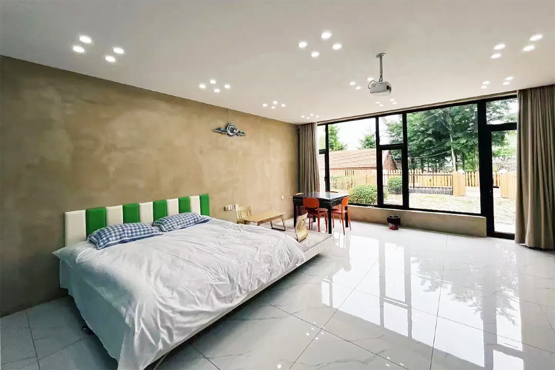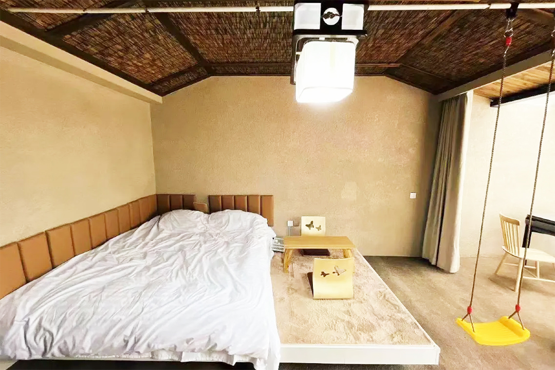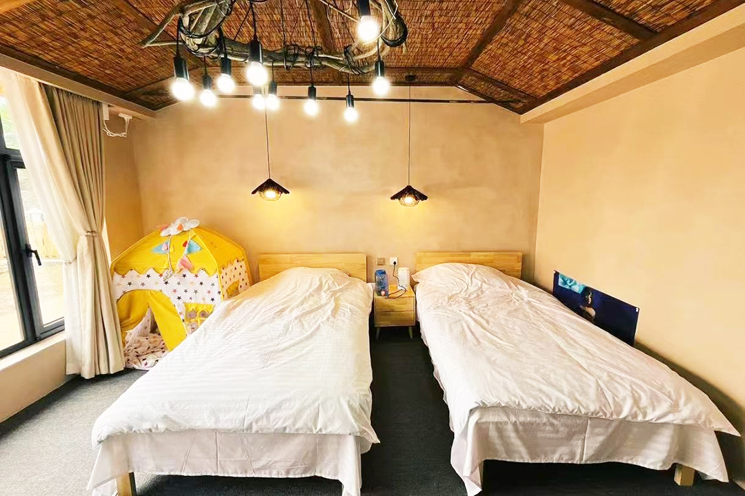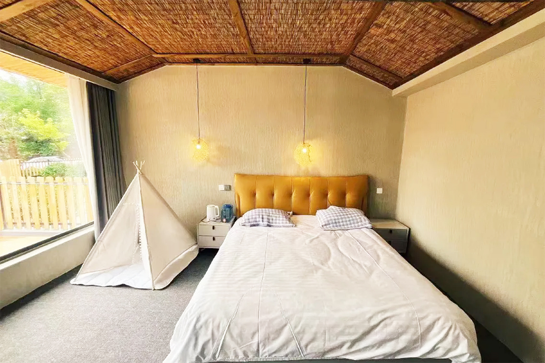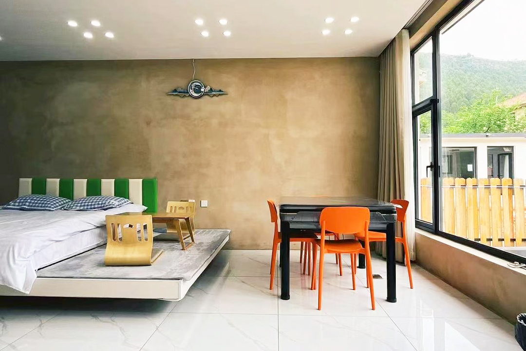 蓟县峪你有缘民宿客房设计注重与自然对话,为您提供有5间精美客房,提供有1间标间、1间大床房、2间榻榻米和1间家庭间,能同时接待11位宾客入住、就餐。房间装修集现代、时尚与复古于一体,浪漫又不失典雅,暖调的配色和原生的家居布置让空间别具一格,全景落地窗将四季山景引入室内,让您晨起可观朝霞染翠谷,夜阑能赏星空缀苍穹。主人还精选高端柔软床品,让您的入住有完全的归属感,尽享家的温馨。