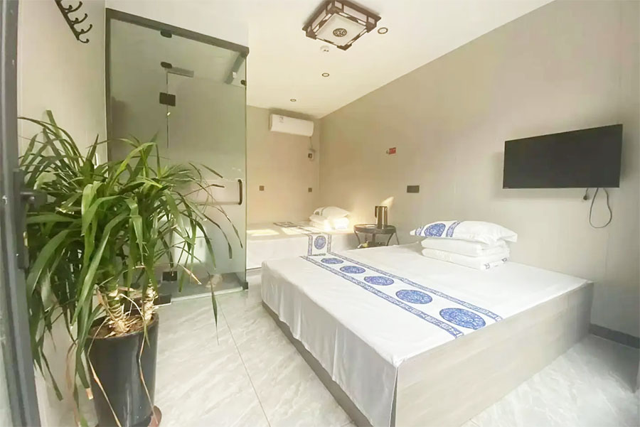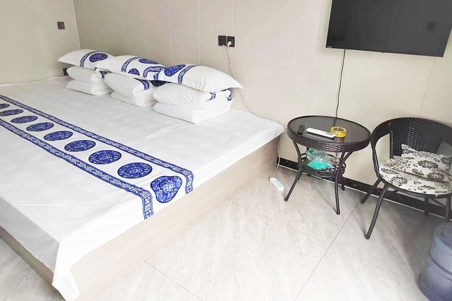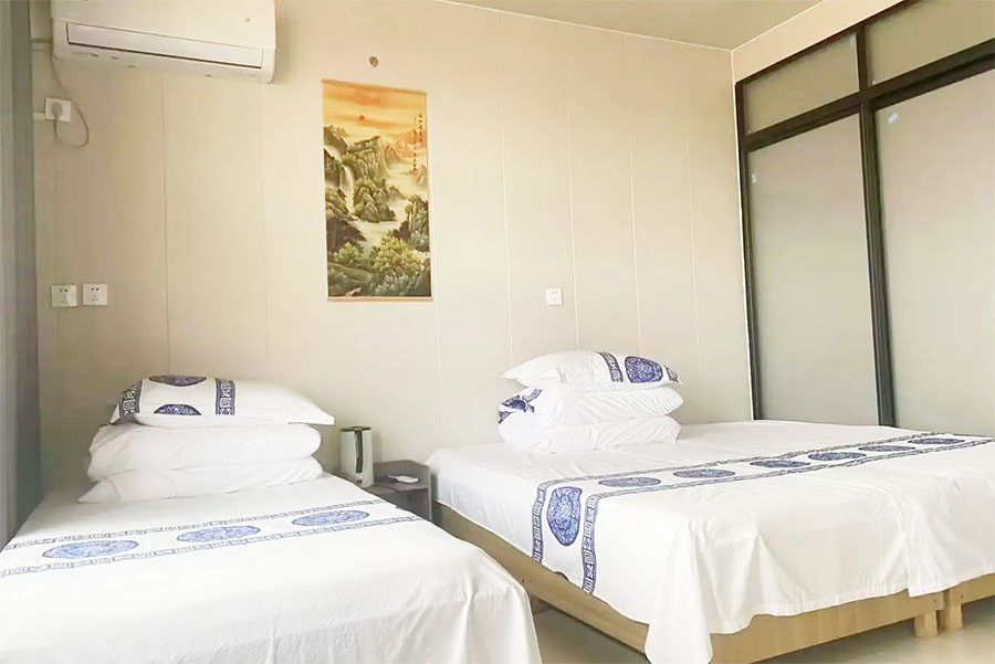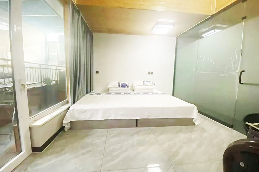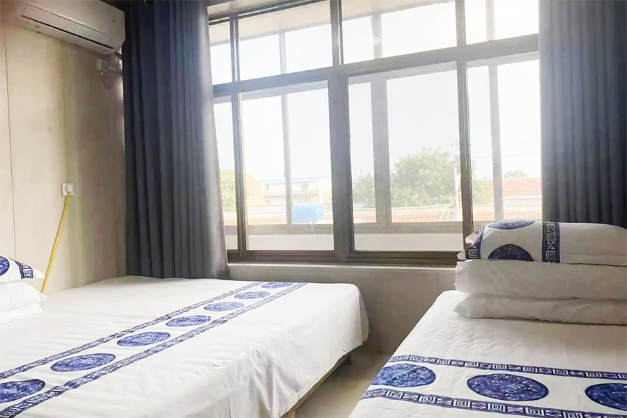 盘山栖舍民宿规模适中,共有7间优质客房,设有标间、亲子间、大床房等不同规格,能同时接待18人入住、就餐。客房设计以极简风格为主,融合山居美学精髓,同时搭配大面积的落地玻璃窗,并配备有空调、电视、无线网、独立卫浴等齐全设施。柔软的床品、柔和的灯光、窗外的光影,共同构筑出静谧舒适的休憩空间,让您一夜好眠。