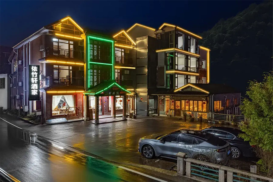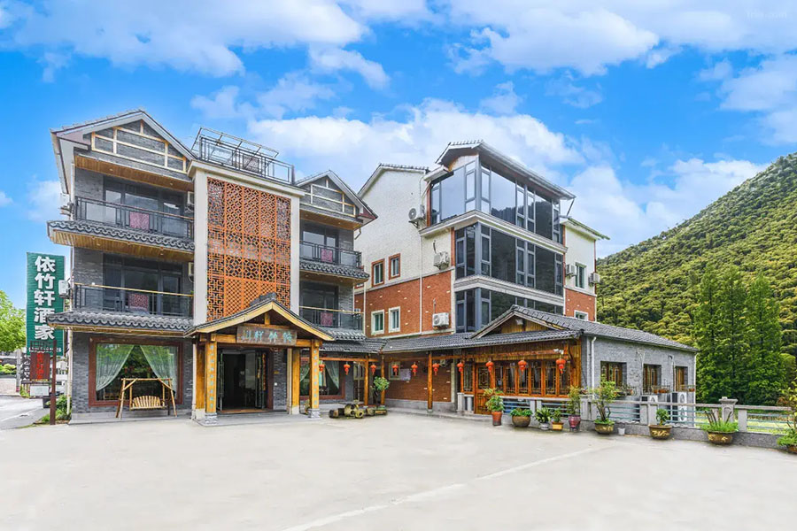 安吉依竹轩酒家位于浙江省湖州市安吉县天荒坪镇五鹤村查家头1号,地处有“中国竹乡”之称的安吉核心腹地,与著名的大竹海景区咫尺之遥,远眺是层峦叠嶂,近观是万竿青竹,可谓是隐于竹海的田园诗画。民宿地处优越,自驾去到云上草原(11公里)、安吉灵溪山、藏龙百瀑、天荒坪...等景点十分便利,既能深度游览自然风光的秀美,也能体验高山玻璃栈道、云中索道、滑草、高空自行车...等户外运动的刺激,堪称一处将身心全然托付给自然的桃源门户。