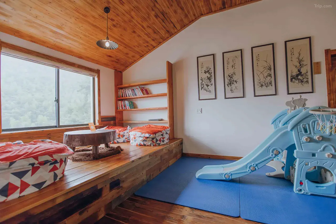 莫干山隐枫精品民宿集餐饮住宿、休闲度假、会议团建于一体,整体设计秉承“融于自然”的理念,简约时尚的现代别墅风格与周边山水浑然一体,门前石阶层层向上,两旁点缀的花草缤纷如画,也给原本单调的空间增添了无限生机。民宿内里属新中式田园装修,环境雅致温润,原木家具泛着淡淡光泽,墙上挂着当地匠人手工绘制的山水油画,还有能让小朋友嗨翻天的滑梯篮球,每一处都散发着归家的温暖,让您在山水间能卸下疲惫。