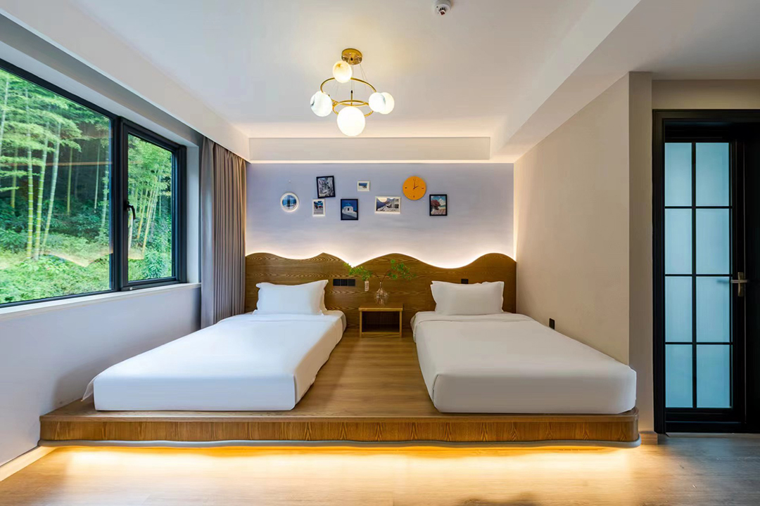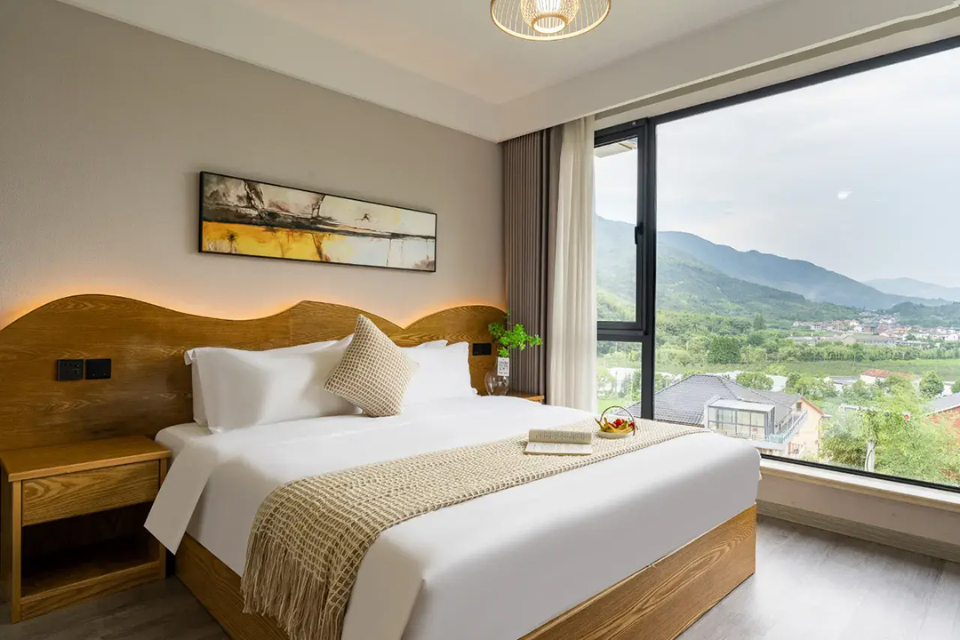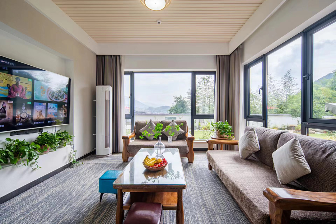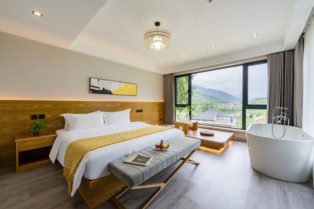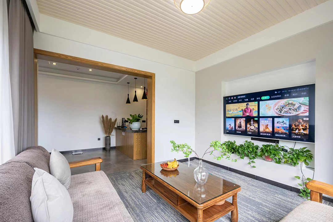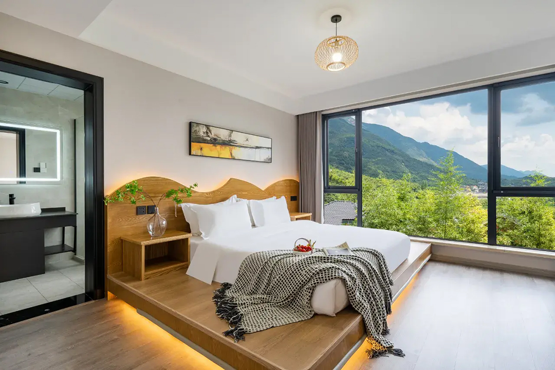 云上草原·竹尚山居景观度假美墅室内装修简约而不失温馨,细节处处彰显主人的用心。为您提供有9间客房,设有3间标间、4间大床房和2间亲子间,能同时接待20人入住。房间采用高级轻奢的田园风格装修,氛围雅致且环境温馨,均配备有智能设备、全景落地窗、浴缸等设施,部分房间还设有飘窗茶台,能让您独享连绵山川与缥缈云海之美,观景视野超棒。干湿分离的浴室与高端品牌家居的设计,更是让山居生活增添了一份奢华体验。