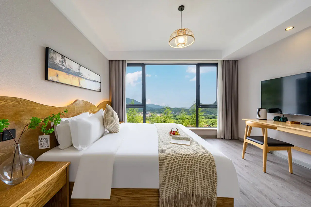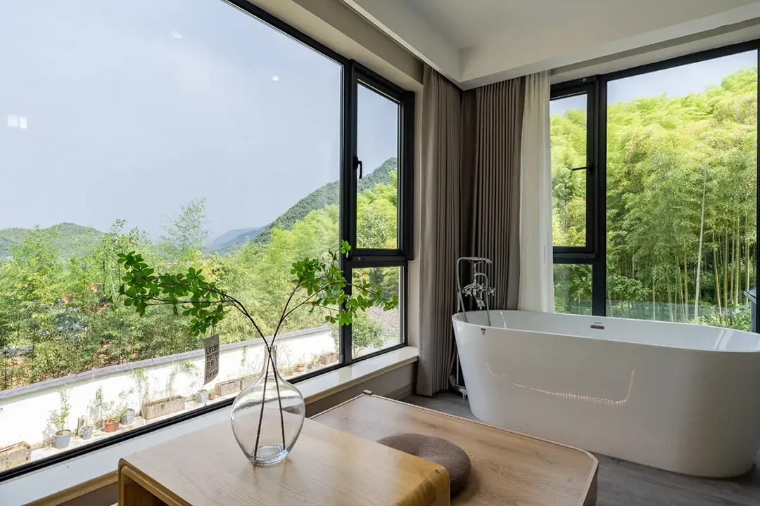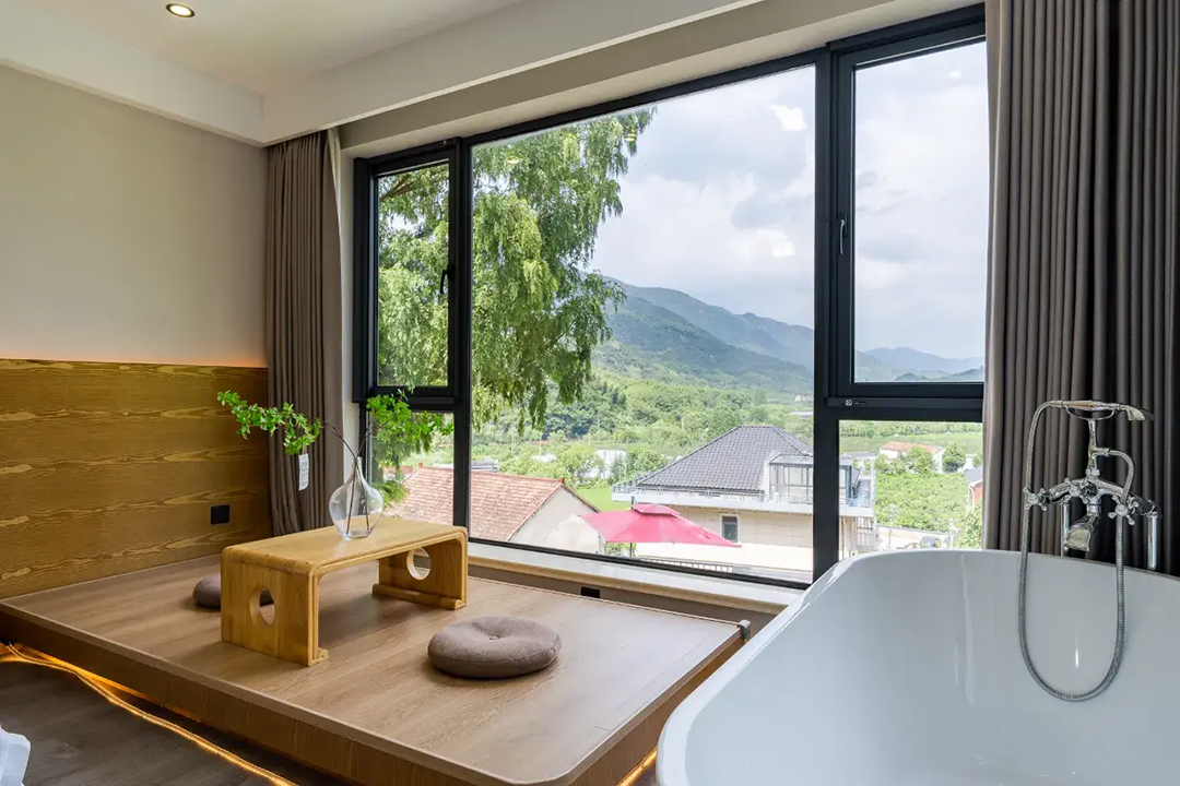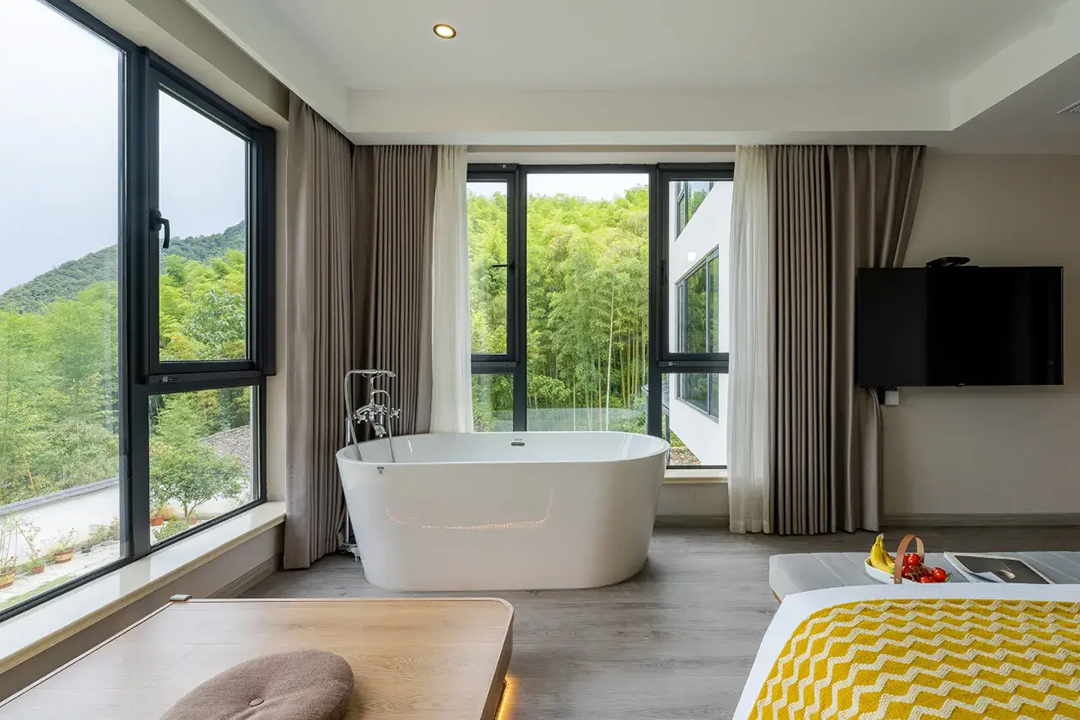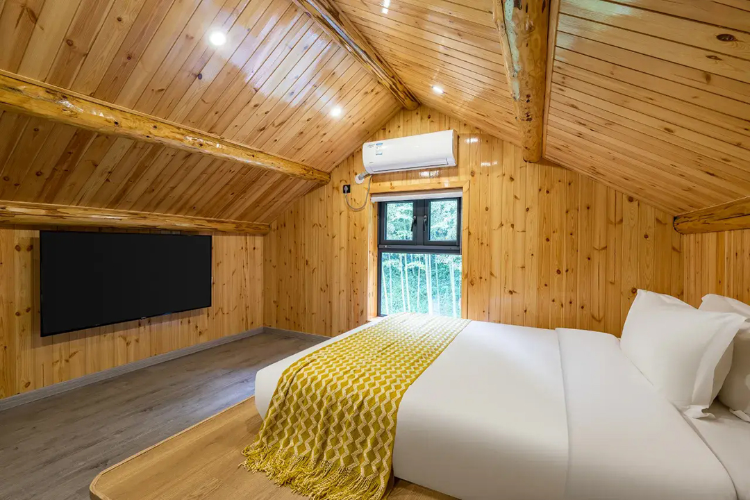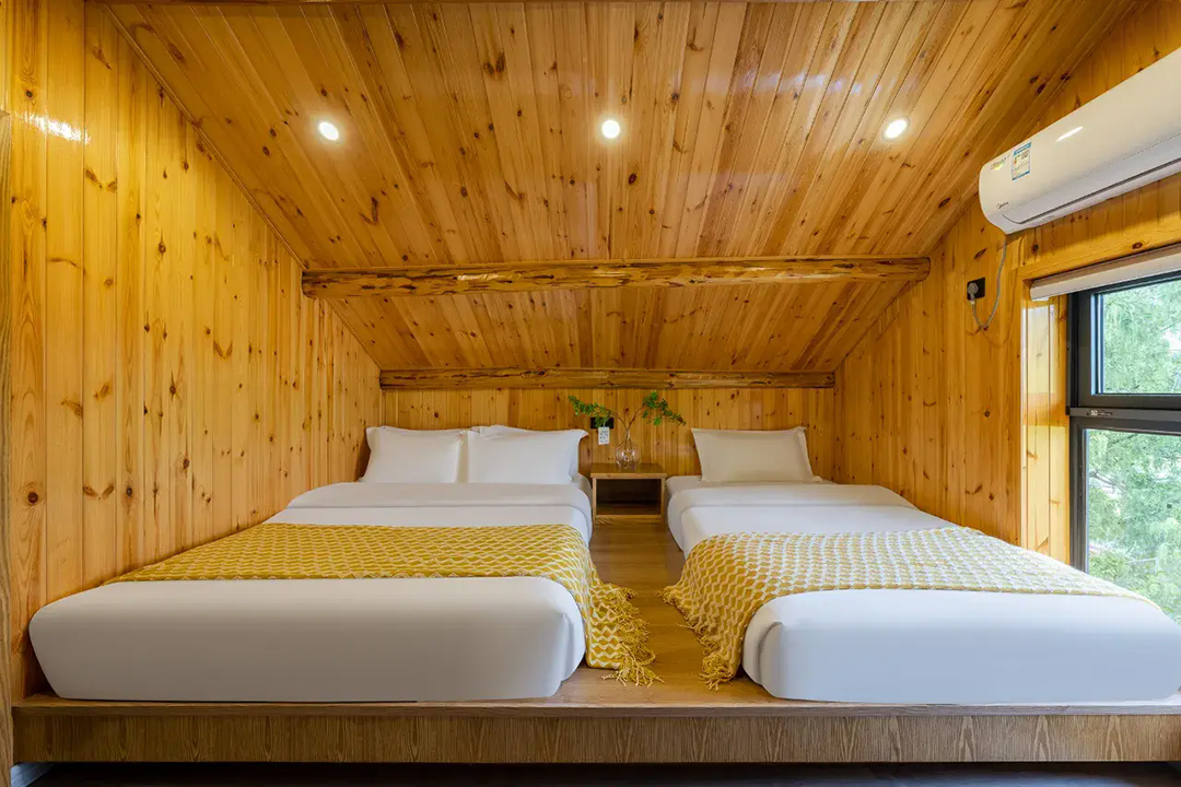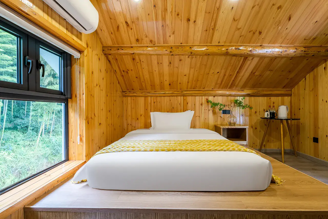 云上草原·竹尚山居景观度假美墅室内装修简约而不失温馨,细节处处彰显主人的用心。为您提供有9间客房,设有3间标间、4间大床房和2间亲子间,能同时接待20人入住。房间采用高级轻奢的田园风格装修,氛围雅致且环境温馨,均配备有智能设备、全景落地窗、浴缸等设施,部分房间还设有飘窗茶台,能让您独享连绵山川与缥缈云海之美,观景视野超棒。干湿分离的浴室与高端品牌家居的设计,更是让山居生活增添了一份奢华体验。