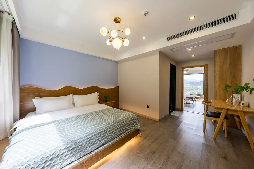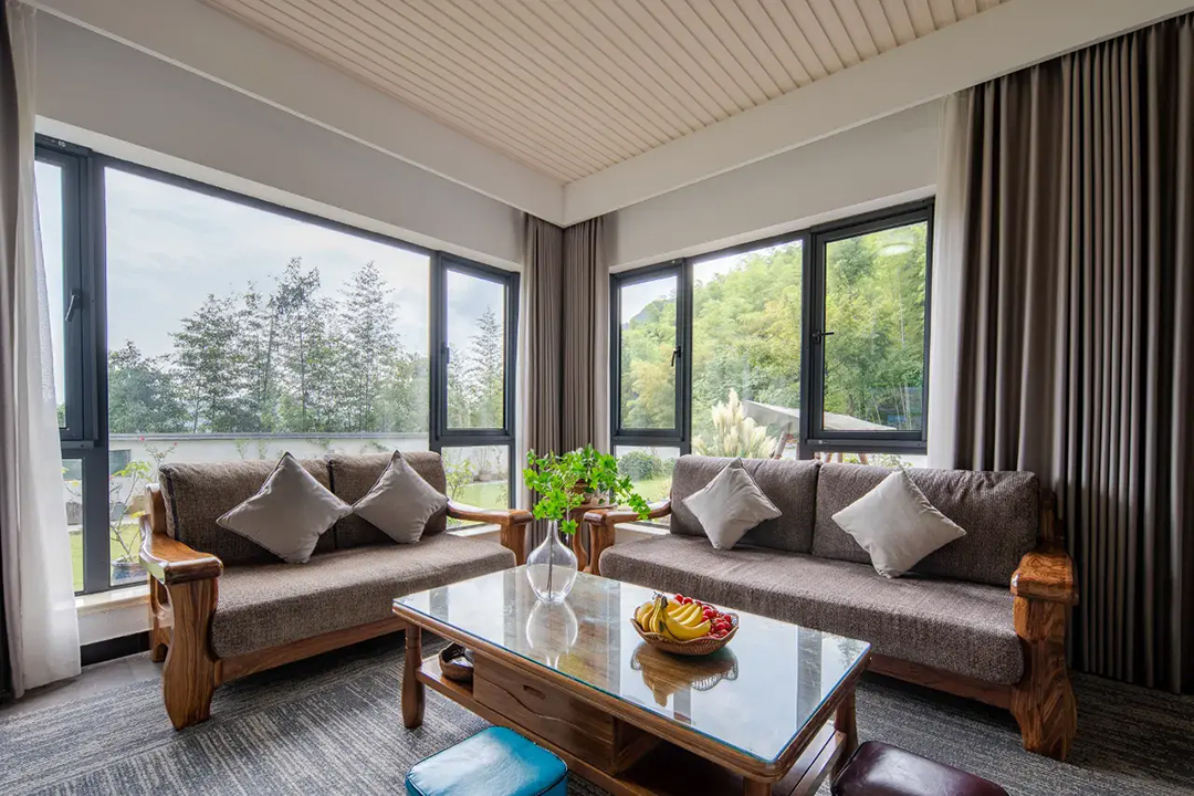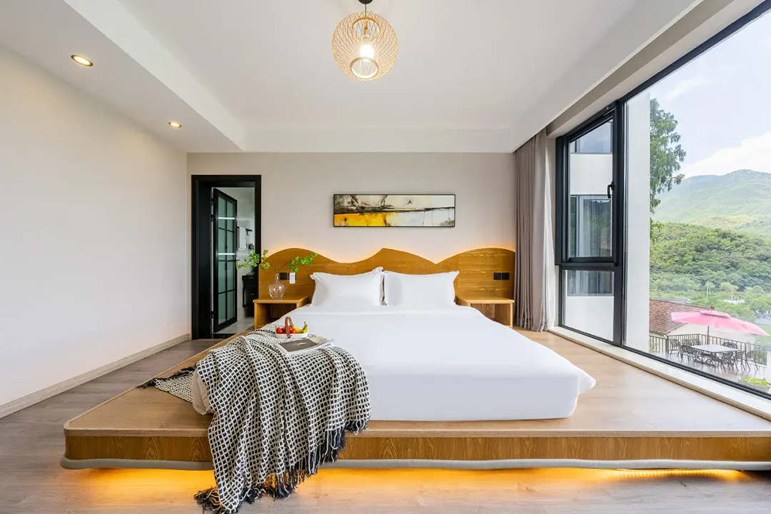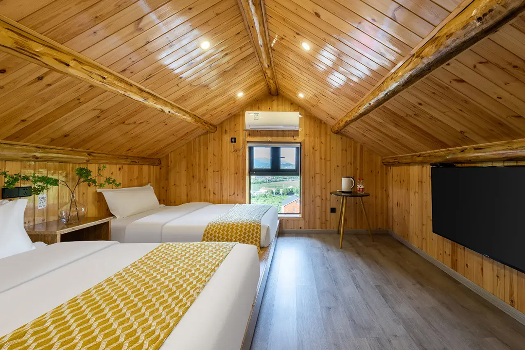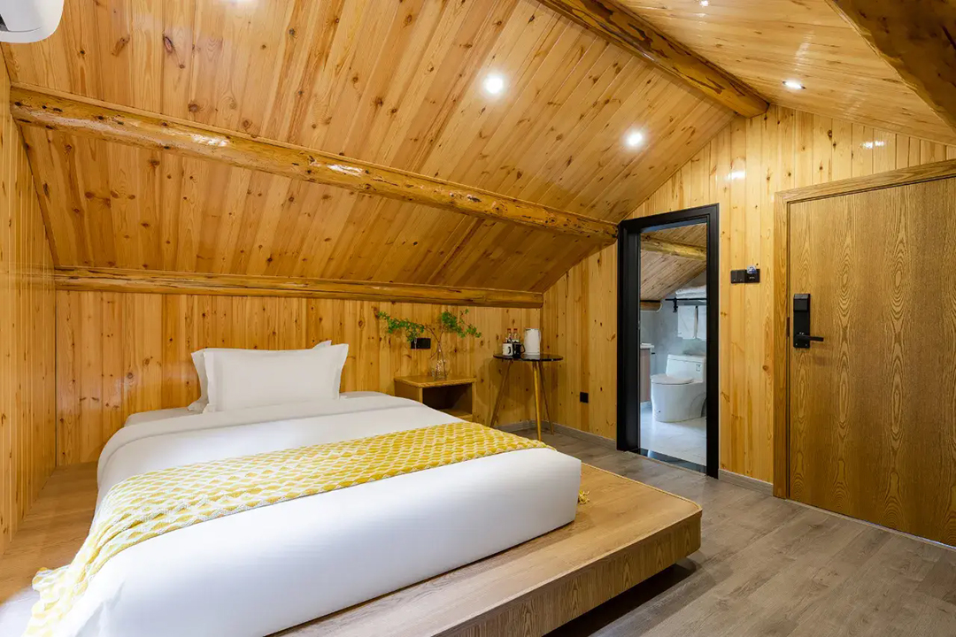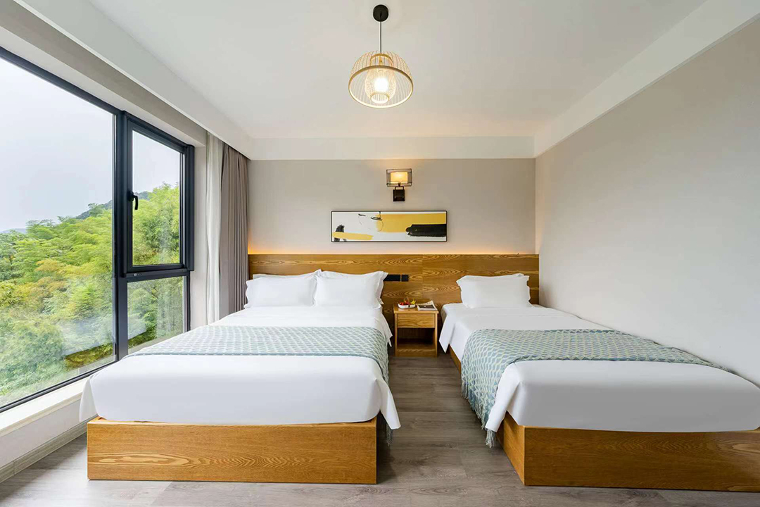 云上草原·竹尚山居景观度假美墅室内装修简约而不失温馨,细节处处彰显主人的用心。为您提供有9间客房,设有3间标间、4间大床房和2间亲子间,能同时接待20人入住。房间采用高级轻奢的田园风格装修,氛围雅致且环境温馨,均配备有智能设备、全景落地窗、浴缸等设施,部分房间还设有飘窗茶台,能让您独享连绵山川与缥缈云海之美,观景视野超棒。干湿分离的浴室与高端品牌家居的设计,更是让山居生活增添了一份奢华体验。